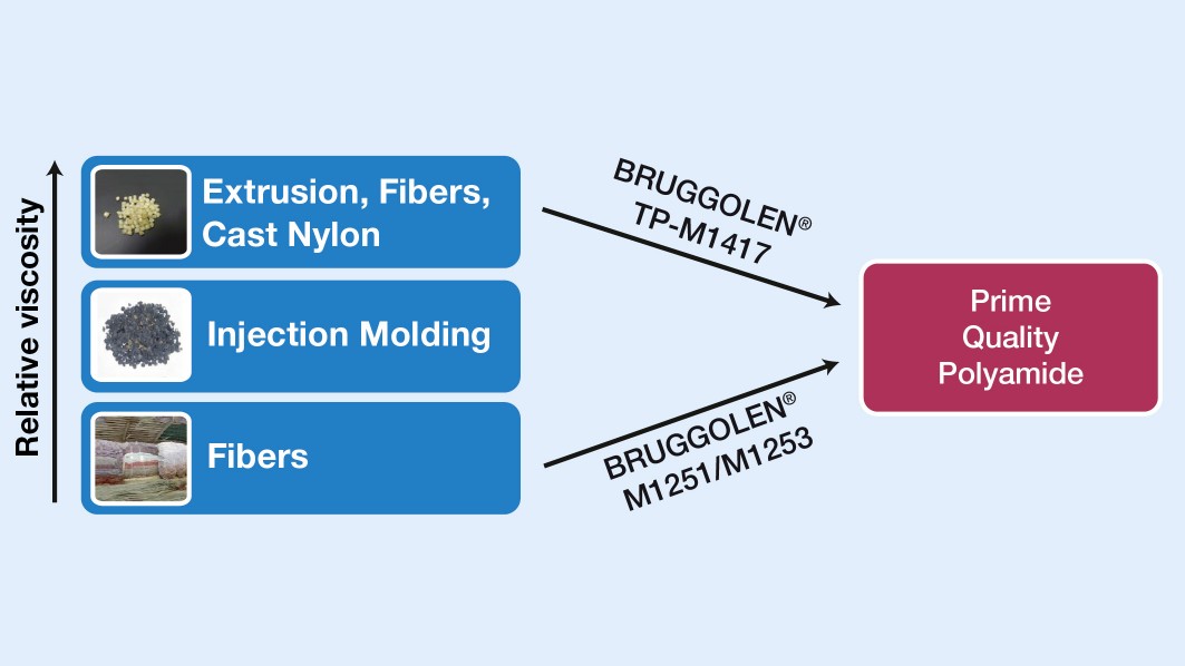 ????????在聚酰胺回收應(yīng)用中,BRUGGOLEN M系列反應(yīng)性鏈改性劑可通過延長過短的鏈或縮短過長的鏈來精確且可重現(xiàn)地調(diào)節(jié)相對粘度。