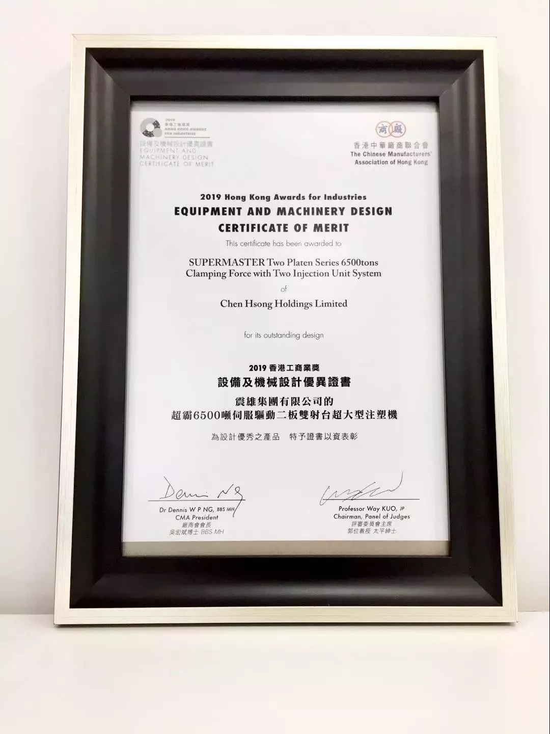 超霸6500噸伺服驅(qū)動二板雙射臺超大型注塑機(jī)獲得香港工商業(yè)獎之優(yōu)異證書獎