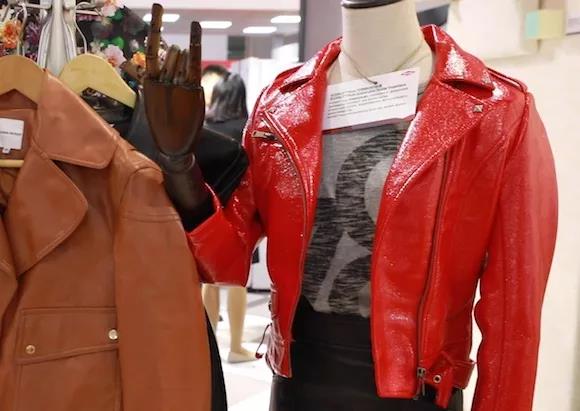 ????????陶氏化學的展臺一角,四件人造革服裝擺放在衣架上。這是該公司在中國首發的水性聚氨酯產品,被應用于這些人造革產品的生產過程中。