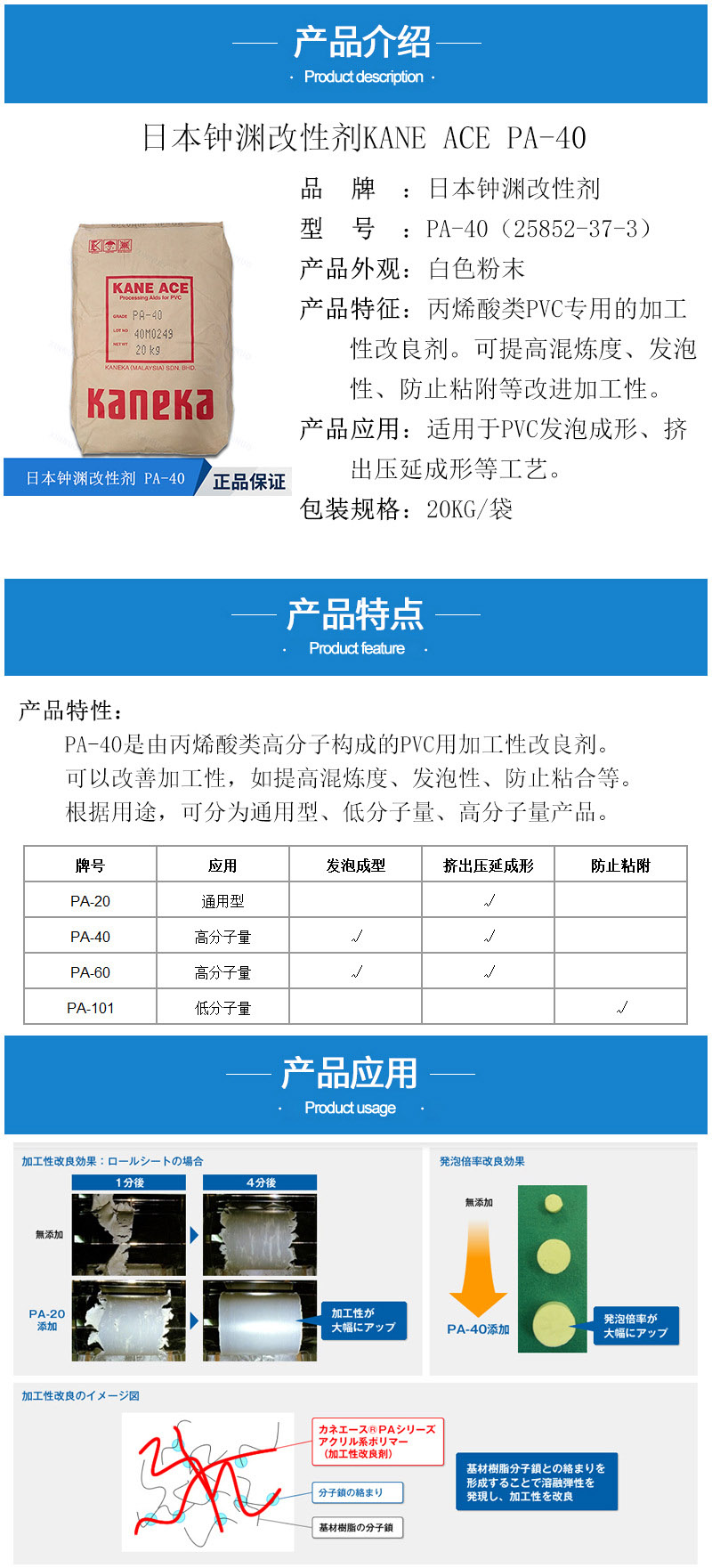 - 日本鐘淵KANE ACE PA-40增韌劑 PVC發(fā)泡混煉改進(jìn)劑 鐘淵mbs PA40 物性表, 日本鐘淵KANE ACE PA-40增韌劑 PVC發(fā)泡混煉改進(jìn)劑 鐘淵mbs PA40 產(chǎn)品參數(shù),日本鐘淵KANE ACE PA-40增韌劑 PVC發(fā)泡混煉改進(jìn)劑 鐘淵mbs PA40 性能表,日本鐘淵KANE ACE PA-40增韌劑 PVC發(fā)泡混煉改進(jìn)劑 鐘淵mbs PA40 出廠報告, MSDS,, 物質(zhì)安全資料表, UL黃卡,{ SGS報告, RoHS, 食品級認(rèn)證, NSF飲用水標(biāo)準(zhǔn), 產(chǎn)品資料, 產(chǎn)品性能, 出廠報告, 原廠原包, 代理商, 熱變形溫度, 熔指數(shù), 流動系數(shù), 抗沖擊性能、沖擊強(qiáng)度, 低溫韌性、低溫抗沖擊性能, 熔體流動系數(shù)、熔體流動速率, 加工工藝、加工參數(shù)、加工溫度, 歐盟RoHS 德國FDA 美國FDA 日本FDA