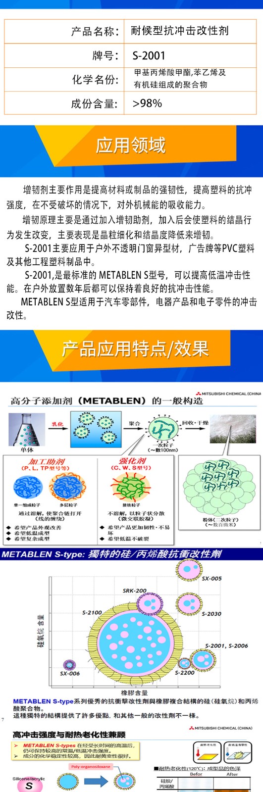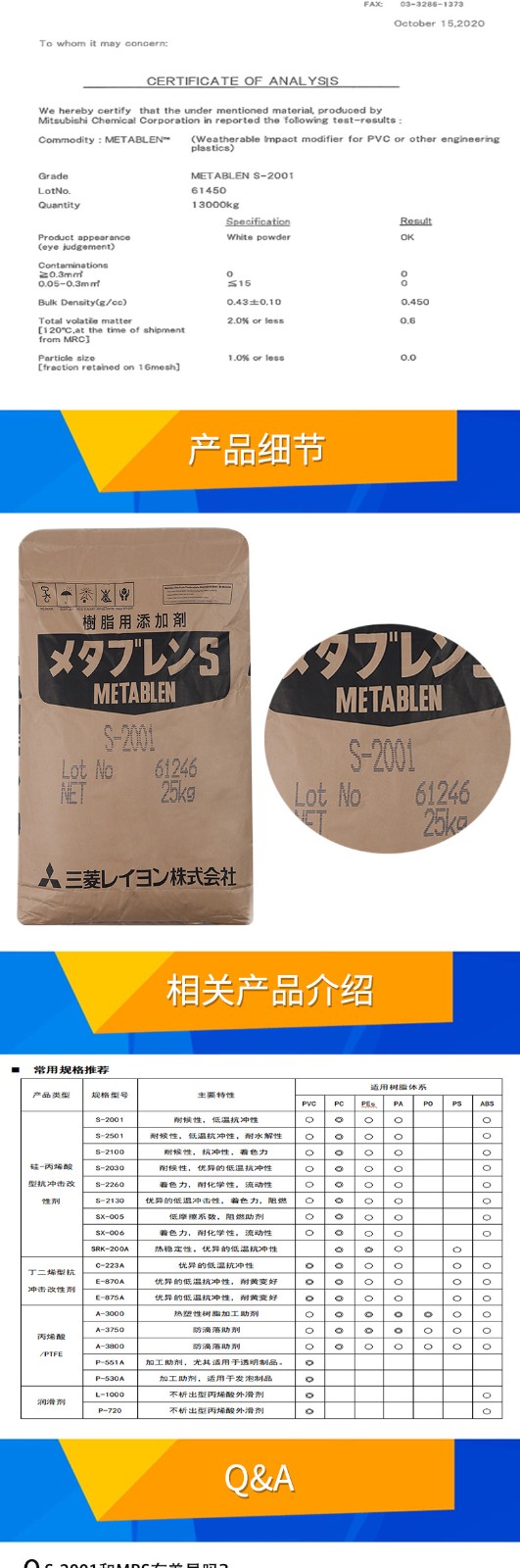- 日本三菱S2001增韌劑 塑料改性 PC增韌耐候耐寒 麗陽(yáng)MBS S-2001 物性表, 日本三菱S2001增韌劑 塑料改性 PC增韌耐候耐寒 麗陽(yáng)MBS S-2001 產(chǎn)品參數(shù),日本三菱S2001增韌劑 塑料改性 PC增韌耐候耐寒 麗陽(yáng)MBS S-2001 性能表,日本三菱S2001增韌劑 塑料改性 PC增韌耐候耐寒 麗陽(yáng)MBS S-2001 出廠(chǎng)報(bào)告, MSDS,, 物質(zhì)安全資料表, UL黃卡,{ SGS報(bào)告, RoHS, 食品級(jí)認(rèn)證, NSF飲用水標(biāo)準(zhǔn), 產(chǎn)品資料, 產(chǎn)品性能, 出廠(chǎng)報(bào)告, 原廠(chǎng)原包, 代理商, 熱變形溫度, 熔指數(shù), 流動(dòng)系數(shù), 抗沖擊性能、沖擊強(qiáng)度, 低溫韌性、低溫抗沖擊性能, 熔體流動(dòng)系數(shù)、熔體流動(dòng)速率, 加工工藝、加工參數(shù)、加工溫度, 歐盟RoHS 德國(guó)FDA 美國(guó)FDA 日本FDA