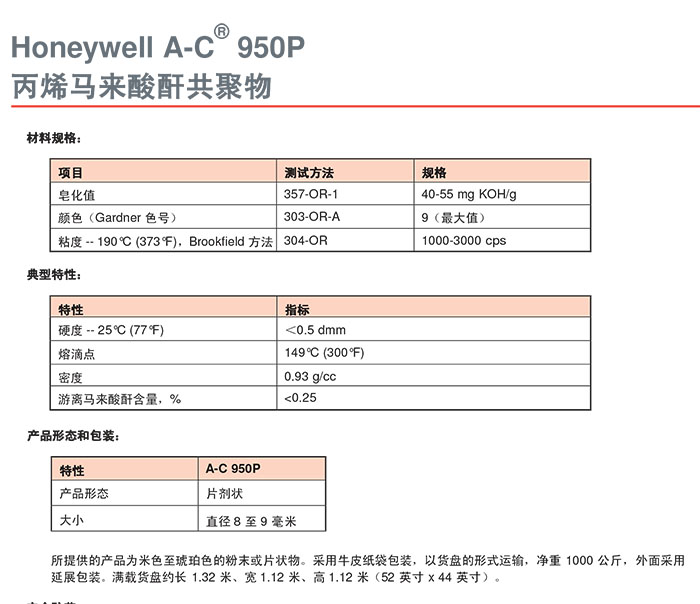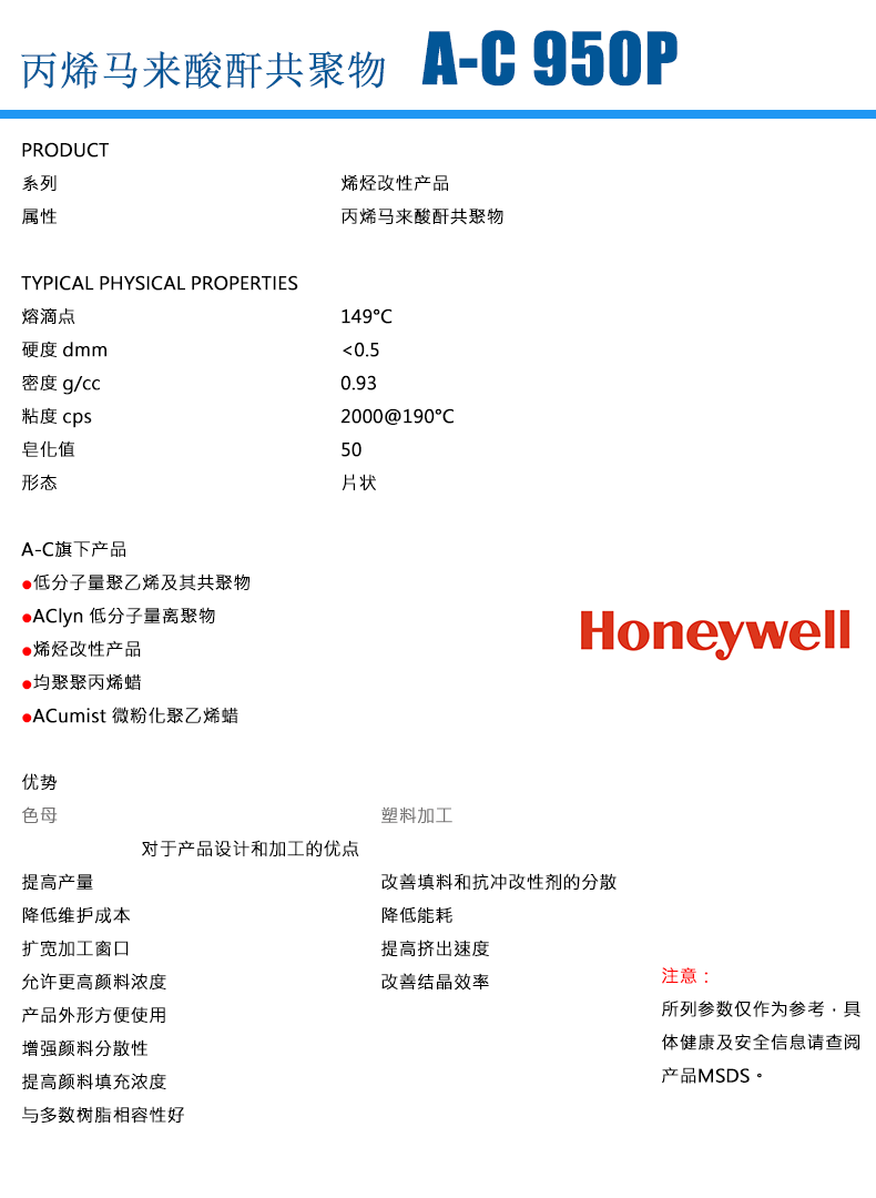 • 霍尼韋爾 honeywell 丙烯馬來酸酐共聚物 A-C 950P 適用熱熔膠電纜塑料改性 物性表, 霍尼韋爾 honeywell 丙烯馬來酸酐共聚物 A-C 950P 適用熱熔膠電纜塑料改性 產品參數,霍尼韋爾 honeywell 丙烯馬來酸酐共聚物 A-C 950P 適用熱熔膠電纜塑料改性 性能表,霍尼韋爾 honeywell 丙烯馬來酸酐共聚物 A-C 950P 適用熱熔膠電纜塑料改性 出廠報告, MSDS,, 物質安全資料表, UL黃卡,{ SGS報告, RoHS, 食品級認證, NSF飲用水標準, 產品資料, 產品性能, 出廠報告, 原廠原包, 代理商, 熱變形溫度, 熔指數, 流動系數, 抗沖擊性能、沖擊強度, 低溫韌性、低溫抗沖擊性能, 熔體流動系數、熔體流動速率, 加工工藝、加工參數、加工溫度, 歐盟RoHS 德國FDA 美國FDA 日本FDA