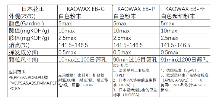 名稱:日本花王分散劑EB-FF商品描述:日本花王KAOWAX EB是一類蠟狀的酰胺,其具有高的熔點,并在熔融狀態時保持低粘...