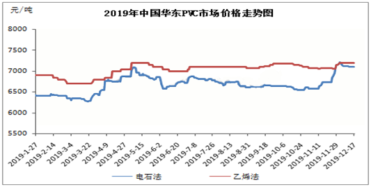 ????????2019年,PVC行情可謂是變化無常,全年呈現旺季不旺、淡季不淡的特點。與往年不同,全年價格最低點出現在3月份,而價格最高點出現在12月。截止12月中旬,PVC市場價格創新高后出現回落,各主銷地區市場價格陸續小幅松動,貿易商出貨多隨行就市為主,個別小幅讓利,下游依舊維持剛需,受利潤空間影響,接貨并不積極。PVC期貨偏弱震蕩以及市場貨源緊缺狀態有所緩解是目前價格出現松動的主要原因,但前期PVC生產廠家檢修后訂單良好,部分廠家貨源依舊不多仍然限制了PVC價格的回落空間。由上圖可以看出,12月上旬PVC華東市場價格雖出現松動,但空間十分有限。此外,PVC生產企業檢修已經完成,預計后期供應將有一定增加,市場貨源偏緊狀態將得到改善。