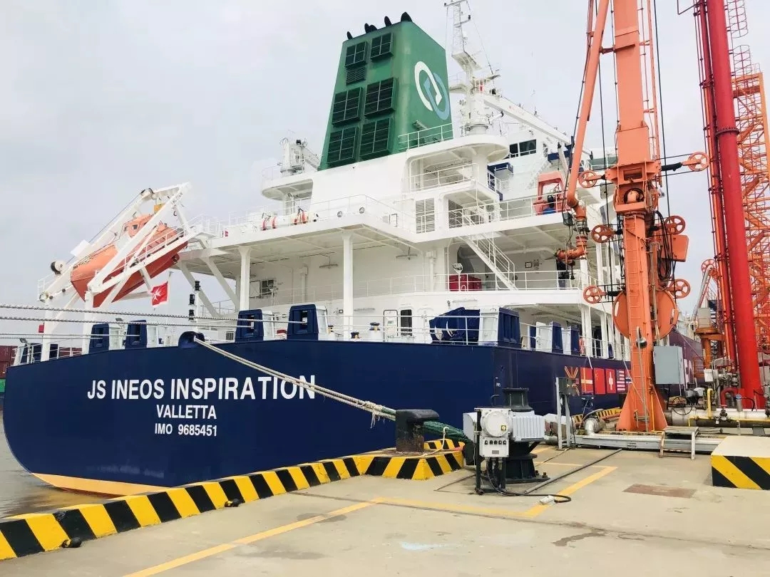 ????????8月7日13時(shí),乙烷運(yùn)輸船“英力士靈感號”靠泊泰興新浦2號碼頭。船上搭載的 1.5萬噸進(jìn)口乙烷在經(jīng)過南京海關(guān)所屬泰州海關(guān)的現(xiàn)場查驗(yàn)后,順利開卸,這也是國內(nèi)企業(yè)首次進(jìn)口乙烷產(chǎn)品。