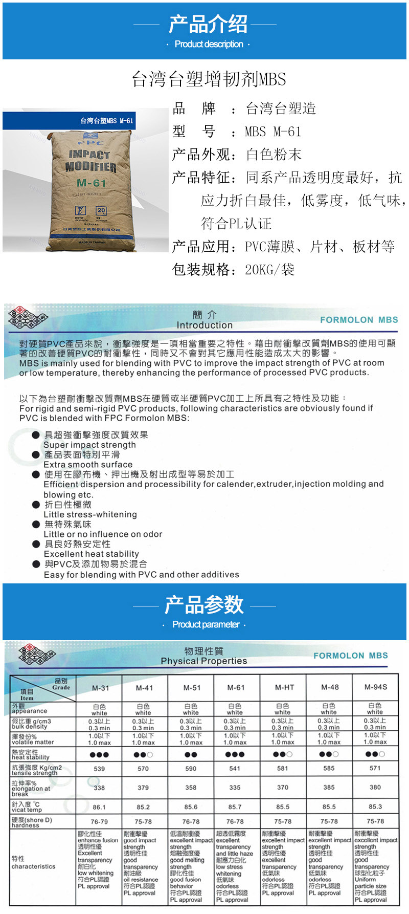 - 臺塑MBS M61高透明性 MBS61 抗折白 PVC簿膜片材板材增韌劑M-61 物性表, 臺塑MBS M61高透明性 MBS61 抗折白 PVC簿膜片材板材增韌劑M-61 產品參數,臺塑MBS M61高透明性 MBS61 抗折白 PVC簿膜片材板材增韌劑M-61 性能表,臺塑MBS M61高透明性 MBS61 抗折白 PVC簿膜片材板材增韌劑M-61 出廠報告, MSDS,, 物質安全資料表, UL黃卡,{ SGS報告, RoHS, 食品級認證, NSF飲用水標準, 產品資料, 產品性能, 出廠報告, 原廠原包, 代理商, 熱變形溫度, 熔指數, 流動系數, 抗沖擊性能、沖擊強度, 低溫韌性、低溫抗沖擊性能, 熔體流動系數、熔體流動速率, 加工工藝、加工參數、加工溫度, 歐盟RoHS 德國FDA 美國FDA 日本FDA