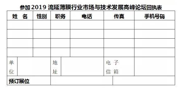 1、請將上述回執(zhí)表于2019年12月20日前發(fā)郵件到ppack@126.com或發(fā)微信到13693270591(流延薄膜)。