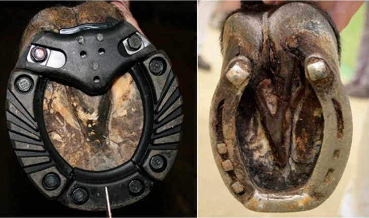 在測試傳統(tǒng)的鋼鞋時,兩匹馬的腳趾抓扣和別針已安裝,而兩匹馬的腳趾區(qū)域只有別針而沒有腳趾抓扣。