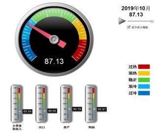 分項景氣指數(shù)中,利潤景氣指數(shù)環(huán)比回升,營收、出口、資產(chǎn)景氣指數(shù)環(huán)比下降,其中:營業(yè)收入景氣指數(shù)85.54,位于“漸冷”區(qū)間,較9月下降0.01點(diǎn);出口景氣指數(shù)為86.66,位于“漸冷”區(qū)間,較9月下降3.59點(diǎn);資產(chǎn)景氣指數(shù)為90.19,位于“穩(wěn)定”區(qū)間,較9月下降0.97點(diǎn);利潤景氣指數(shù)89.91,位于“漸冷”區(qū)間,較9月回升0.82點(diǎn)。